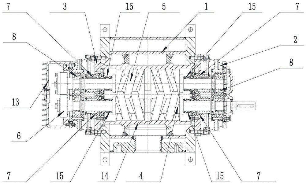 为实现上述目的,本实用新型提供如下技术方案:一种液体硫磺输送泵,其特征在于:包括泵体、前轴承座、后轴承座、主螺杆轴、从螺杆轴、同步齿轮、密封函体、轴承和循环阀;所述循环阀与泵体采用整体焊接成型,所述泵体采用双层焊接结构,高温蒸汽通过泵体伴热法兰进入泵体夹层中对泵体进行全保温,所述主螺杆轴和从螺杆轴的两端分别通过轴承与泵体连接,前轴承座和后轴承座分别固定在泵体内部的前后两侧,主螺杆轴两端分别通过密封函体与前轴承座和后轴承座连接,从螺杆轴两端分别通过密封函体与前轴承座和后轴承座连接,前轴承座和后轴承座采用双层焊接结构形成轴承座夹套层,冷却水通过冷却法兰进入轴承座夹套层内,所述密封函体采用双层焊接结构形成密封函夹套层,高温蒸汽通过加热法兰进入密封函夹套层内,主螺杆轴和从螺杆轴的一端通过同步齿轮相互啮合。