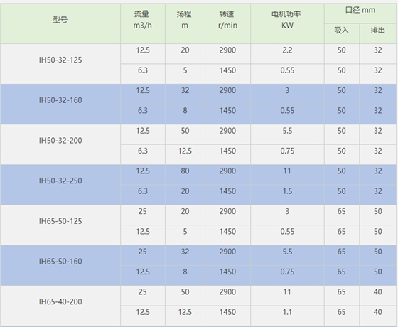 IH不锈钢化工离心泵为单级单吸悬臂式离心泵,其标记、额定性能点和尺寸等效采用标准ISO2858-1975(E)、具有性能范围广、效率高、"三化"水平高和维修方便等特点,其效率比F型泵平均提高5%,是机械工业部确定取代F 型耐腐蚀离心泵的节能、更新换代产品。供输送不含固体颗粒具有腐蚀性、粘度类似水的液体。 此系列的化工泵输送介质温度为-20℃~105℃,需要时采用双端面密封冷却装置,可输送介质温度为20℃~+280℃。适用于化工、石油、冶金、电力、造纸、食物、制药、环保、废水处理和合成纤维等行业用于输送各种腐蚀的或不允许污染的类似于水的介质。