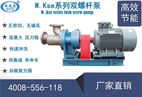 WKse双螺杆泵是专门为高粘度、低粘度化工介质而设计,采用防腐蚀不锈钢材料,分为机械密封和填料密封型,也可以分为加热型和普通型,流量控制灵活,采用变频调速实现额定流量的随意调节;结构简单紧凑,便于设备在线维修。在输送丁苯胶乳/氯丁胶乳或丁晴橡胶时具有彻底解决汽蚀问题、无剪切、不破乳、转子有自清洁作用、防止挂胶的特点。