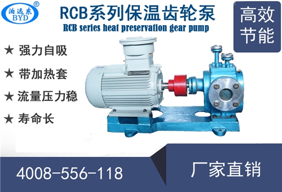 RCB保温泵齿轮泵泵体前盖后盖设有空心夹套、进出口法兰.该泵适用于常温下有凝固性及高寒地区室外安装和工艺过程中要求保温的场合,能用导热油、蒸汽、热水、冷水等媒体对输送的液体和泵进行加热,保温与冷却。当输送介质的粘度大于1500CST时,应采用减速机。
